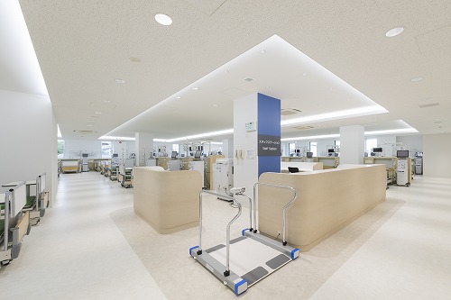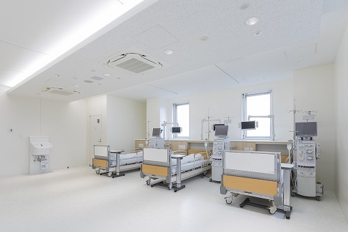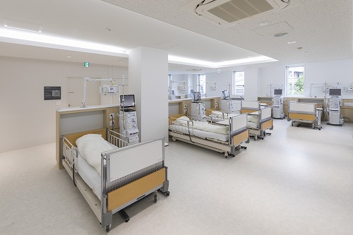 外来には血液透析療法の患者様も通院されており、現在50床の血液透析ベッドを運用しております。血液透析療法の設備は、ハイグレードな機材と装置を完備しており、精度の高い水質管理を行い、クリーンな透析液を常に供給できるよう努めています。